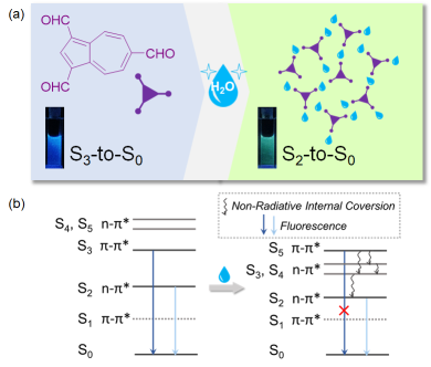 图1. (a) 1, 3, 6-三醛基薁的结构及氢键调控的发光变化示意图;(b) 在DMF/H2O混合溶剂中发光变化的可能机理。