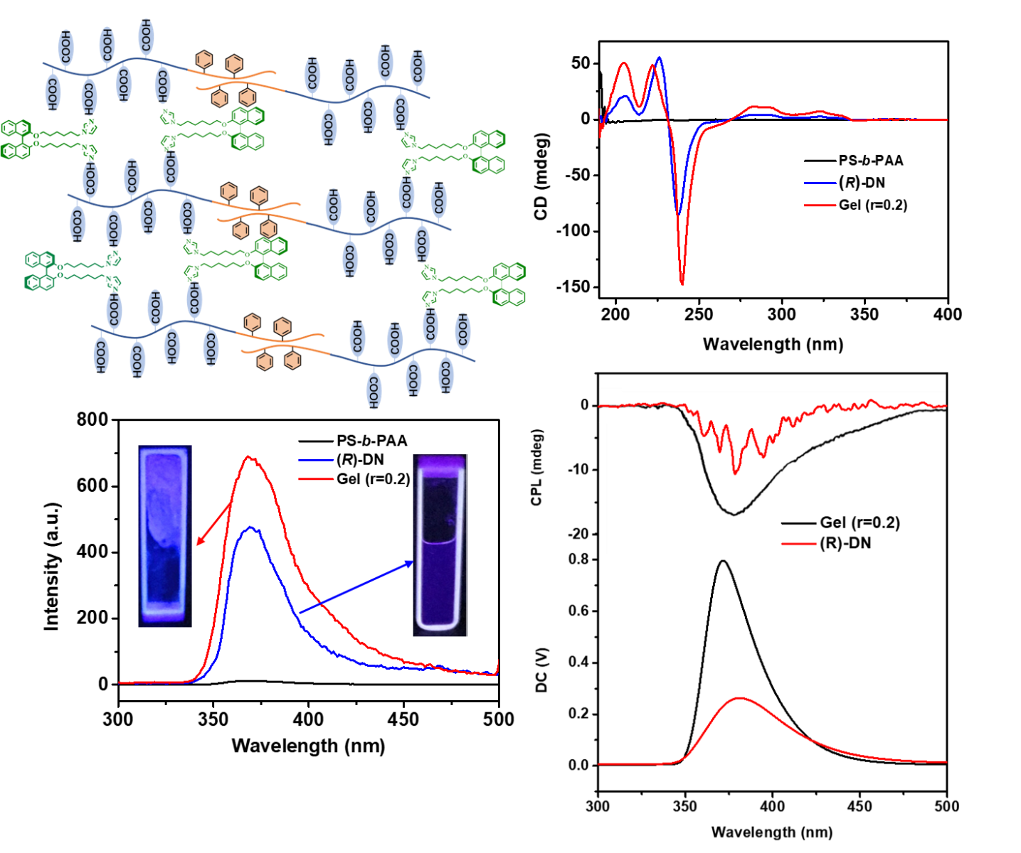 面对这一挑战,朱亮亮团队设计出分层共组装体系以充分放大有机凝胶与对映体结构的立体选择性相互作用。他们将具有轴手性的分子“连接器”—带有咪唑基修饰的联萘基衍生物(R)-DN通过氢键作用与非手性嵌段共聚物PS-b-PAA在乙醇中发生共组装,手性传递作用诱导形成具有相分离结构的扭曲纳米纤维。嵌段共聚物的微相分离结构有效的将联萘基团分隔开来,使超分子结构具有荧光增强、圆二色信号(CD)和圆偏振发光(CPL)放大效应(Fig. 2)