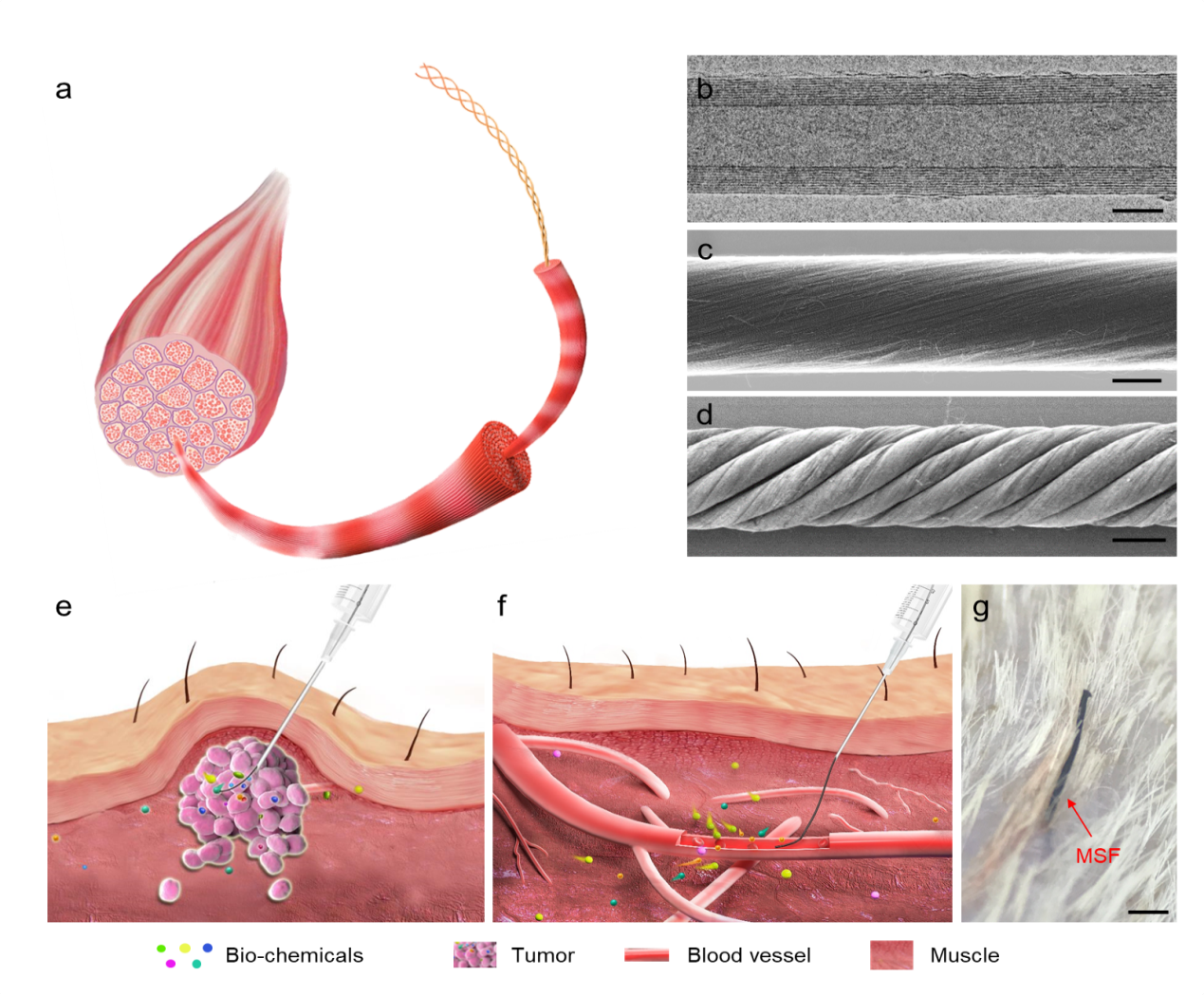 a:肌肉多级螺旋结构示意图;b:多壁碳纳米管纤维的透射电镜图,标尺3 nm;c:单根碳纳米管纤维的扫描电镜图,标尺6 μm;d:多根碳纳米管纤维的扫描电镜图,标尺20 μm;e和f:纤维器件植入到肿瘤和血管的示意图;g:纤维器件植入后在皮肤表面形态,标尺500 μm
