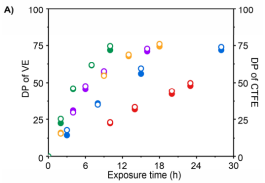 图2 CTFE和乙烯基醚(VEs)的交替共聚动力学研究。A)CTFE(实心点)与VE(空心点)的聚合度与时间的关系。B)ln([M]0/[M]t)与光照时间的关系,[M]0和[M]t分别代表VE在0,t时间下的单体浓度。不同颜色点代表不同的VE单体:SiBVE (绿), EVE (黄), IBVE (紫), BVE (蓝) 和CEVE (红)