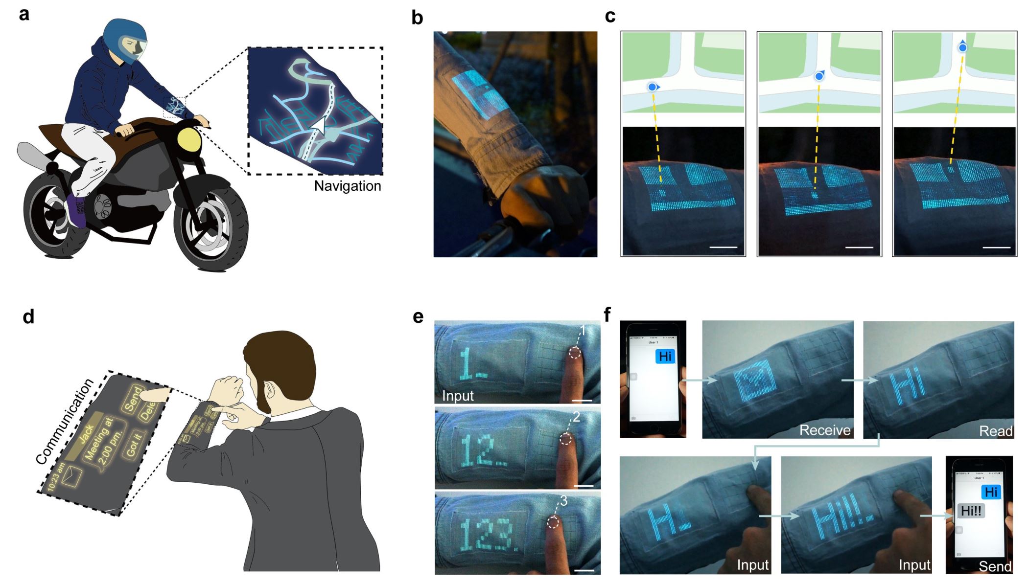 图3. a-c) 具有显示个人定位功能的织物集成系统;d-f) 具有信息通讯功能的织物集成系统,功能集成织物系统与智能手机进行信息接收和发送(f)。