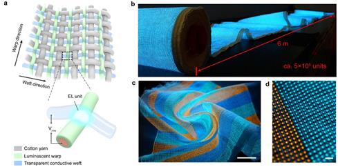 众所周知,织物在编织过程中,经纬线的交织在织物中自然地形成了类似于显示器像素阵列的点阵。因此,基于一种负载有发光活性层的发光经线,和一种透明导电纬线,研究团队利用这两种功能纤维在编织过程中的经纬接触形成电致发光器件,进而实现了一种新型柔性发光和显示织物(图1)。