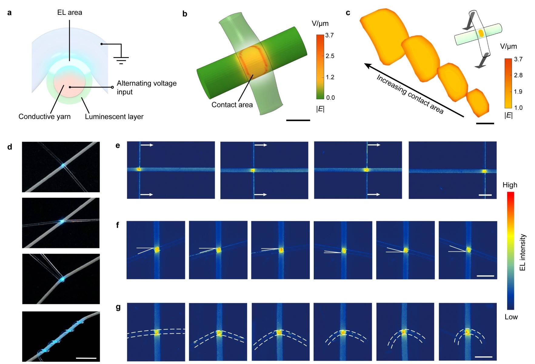 图2. a) 经纬搭接发光点截面示意图;b) 经纬搭接点处电场分布模拟;c) 接触面电场的均匀分布几乎不受接触面积改变的影响;d) 透明导电纬线与发光经线在不同接触形态下的发光照片;e-g) 透明导电纬线与发光经线发生相对滑移(e)、旋转(f)和弯曲(g)时发光点的光强分布图。
