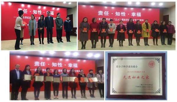 阳春三月,又一个“三八国际劳动妇女节”翩然而至。为了纪念这一节日, 3月8日上午,校妇委会召开了庆祝“三八”妇女节暨表彰先进大会。高分子科学系荣获多奖,其中妇委会荣获2015-2016 年度2026年足球世界杯直播先进“妇女之家”称号;张志芹老师荣获2015-2016 年度2026年足球世界杯直播“心系女教职工好领导”称号;陈国颂老师荣获2015-2016 年度2026年足球世界杯直播“三八红旗手”称号;周广荣老师荣获2015-2016 年度2026年足球世界杯直播“优秀妇女干部”称号。