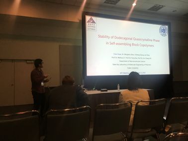我们课题组师生在这次会议中共有四场口头报告,导师李卫华教授的报告内容是ABAB型嵌段共聚物自组装形成稳定的混杂层球相,对于我们同行做报告的三位同学而言,要在这样的场合做英语口头报告确实是一项挑战。在报告的前几天大家都觉得有些压力,为此在报告的前几天时间里做足了准备功课,因而最后的报告也达到了预期的效果。报告结束,史安昌老师走过来说了一句“Good Job!”让大家紧张的心情瞬间轻松下来。值得一提的是,由于报告内容新颖,我们的报告吸引了学术大牛Frank Bates教授的关注。在李卫华老师精彩的报告结束后, Bates教授跟李老师对话的过程中可知,他对我们课题组的研究工作给予了很高的评价。与国际知名学者零距离交流中,提到的不少学术问题实际上都可以作为未来尝试的研究课题,在我们看来意义重大。