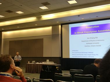 APS会议的内容可以用浩瀚来形容,为期五天的会议,每天从早至晚不间断的在各个会场进行,在总共数千个报告中,即使想遍览其中一小类也会感到应接不暇。此次我们主要关注了DPOLY和GSOFT两个与聚合物体系高度相关的分会场。聆听会场报告让我们捕捉到了很多有用的信息,比如关于受挫体系的系列工作介绍,让我们很快获得了全局的认识与最新的研究体会,极大地拓宽了自己的研究视野;加拿大McMaster大学的史安昌教授还报告了与我们课题组合作的最新研究,即受挫(frustration)在嵌段共聚物自组装中的关键作用;Minnesota大学Frank Bates教授报告中主讲的嵌段共聚物链长N对有序-无序相边界附近的涨落效应影响,可以更加直观地感受到我们使用的自洽场理论(N=∞)的适用性。