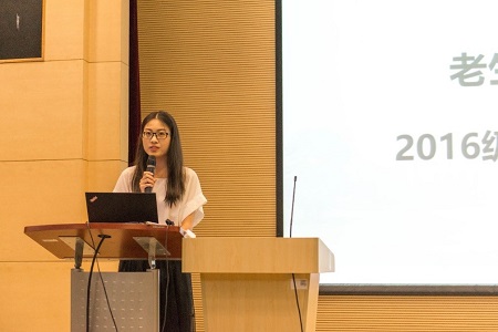 2016级硕士生王丹妮作为老生代表,将自己在复旦学习生活的六年经验分享给新生,帮助他们尽快融入复旦、学会科研。王丹妮说:“在这里我想与你们分享的不是学术秘籍和生存指南,而是一些我认为重要的事情。一是不忘初心,请各位好好记住此刻刚迈进高分子系时对自己的期望,请坚定不移地走下去。有时候可能你并不知道现在做的事情会有什么意义,但请不要放弃。二是拥抱无限可能,建议各位除了钻研于学术科研,空余时能广泛涉猎,同时增加生命的宽度与专业的深度。三是良好的时间管理,变焦虑为掌控,大大提升幸福感。最后是平常心,科研上的失败再正常不过了,对我们每个人来说,唯一的失败就是没有能够充分发挥自身潜能,成为最好的自己。”
