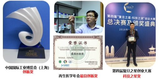 除了科学研究本身的累累硕果,经过二十余年的研究积累,他们积极突破成果转化“最后一公里”,团队的可注射热致水凝胶项目于2014年荣获国家教育部自然科学“一等奖”。目前该导学团队的可注射热致水凝胶产业化前景得到学术界、医学界和商业界的高度认可,相继获得中国国际工业博览会“创新奖”、再生医学材料以科技引领健康项目“最具创新奖”、第十七届中国国际高新技术成果交易会“优秀产品证书”、第四届复旦之星创业大赛“科技之星奖”等多项重量级荣誉,其中本导学团队的热致水凝胶发明人之一俞麟老师还接受了上海电视台的采访。