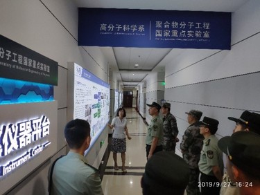随后,高分子科学系教职工及硕博党员带领政治学院一行参观了系楼,重点介绍和讲解了聚合物分子工程国家重点实验室展厅、共享仪器平台及各课题组的研究墙报,让各位军人对复旦高分子现阶段的研究方向及重点有所了解。