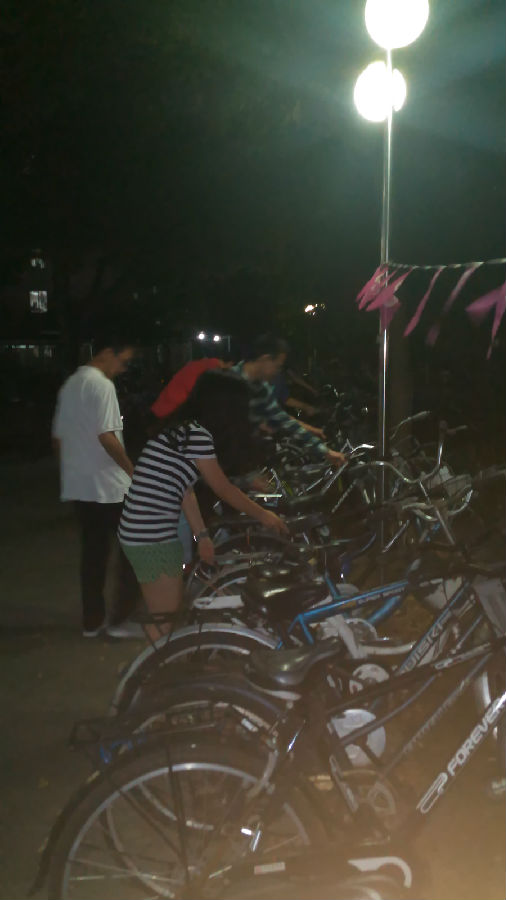 晚10时许,大多数同学已经回到寝室,楼下的自行车停得满满当当,但排列散乱,既挤占了停车空间,又妨碍了同学们取车。有的同学回来得较晚,便很难找到合适的车位。此外,宿舍楼前有许多往届的学长学姐留下来的自行车,这些车子长期没有人来处理,占用了很多宝贵的停车空间。因此,本次的实践活动有两项任务,一是将同学们的自行车排放整齐,二是将已经被遗弃的自行车搬到不影响同学们停车的地方。