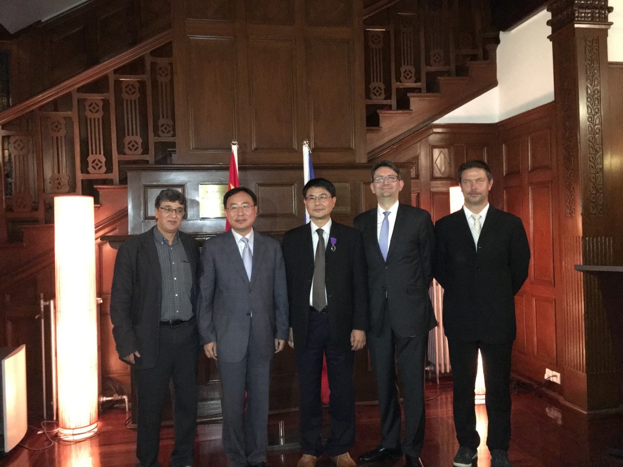 2015年10月29日晚,在法国驻上海总领事官邸隆重举行了授予重点实验室主任陈建民教授法兰西共和国棕榈叶教育骑士勋章的授勋仪式。在授勋仪式 上,法国驻上海总领事柯瑞宇(Axel Cruau)先生代表法国政府向陈建民教授颁发了棕榈叶教育骑士勋章,以表彰他多年来为促进中法两国在教育、文化交流合作领域所做出的杰出贡献。