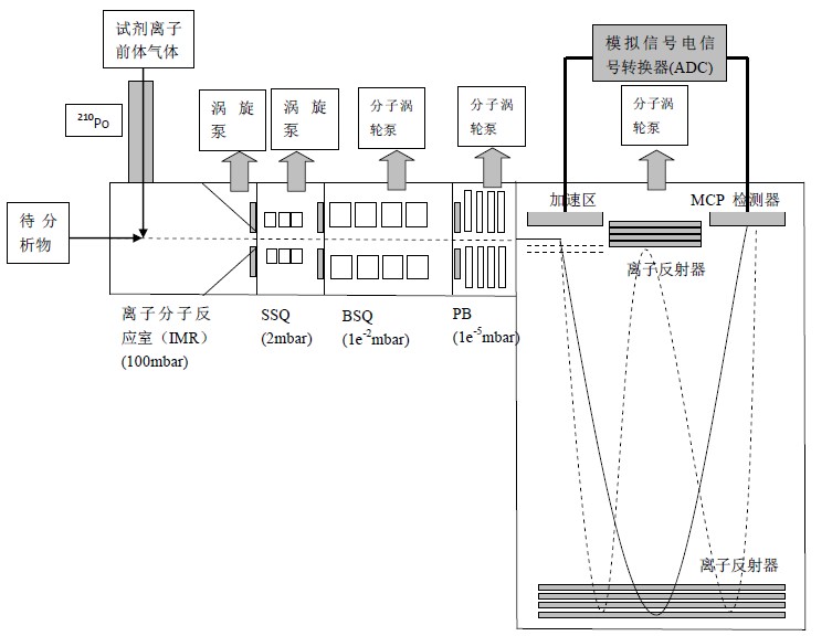化学电离飞行时间质谱由分子离子反应室(ion molecule reaction chamber, IMR)、3个真空室(SSQ、BSQ和PB)、飞行时间质谱(TOFMS)、真空泵(vacuum pumps)、质谱仪供电器(TOF power supply,TPS)和电脑(personal computer,PC)组成,如图所示。工作原理是待分析物通过与放射源产生的试剂离子发生离子-分子反应带电,然后进入飞行时间质谱,由于不同物质的质量不同,离子到达检测器的时间不同,从而将不同物质分离开来,得到待分析物的性质及浓度。