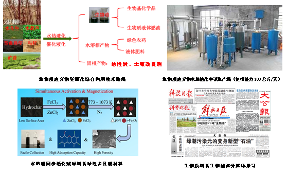 研发了生物质废弃物水热液化技术,以环境污染或环境污染治理副产物生物质(浒苔、水葫芦等)、农林废弃生物质(沙柳、绿化树枝树叶、稻草、麦秸、玉米秸秆等)、制药生物质废弃物(药渣)为原料,水热定向催化转化为富含高附加值化合物的液相产物和含碳固相产物(水热炭);研发了液相产物高附加值化学品分离提纯技术,分离提纯得到2,6-二甲氧基酚等高附加值化学品;研发了水热炭活化制备活性炭技术,制备得到高比表面积和孔容的活性炭和磁性炭材料,并用于吸附三氯生、四环素等环境污染物;研究了水热炭土壤修复潜力和污染物迁移转化规律。建成生物质废弃物水热液化、液相产物分离提纯、固相产物活化制备炭材料实验室研究平台;建成日处理100公斤的生物质液化中试研究平台。发表SCI论文30余篇,2篇入选ESI高引用论文;申请国家发明专利26项,授权6项。在国际国内学术会议上做分会场召集人或共同主席11次,做邀请报告15次、口头报告6次。东方卫视、科技日报、央视网等几十家媒体多次予以报导,引起广泛关注。