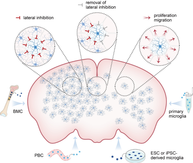 Figure 2 Lateral inhibition restrains microglial proliferation and migration, and microglia replacement can be achieved using donor cells from different sources. (Image from Rao et al., Cell Stem Cell, 2025)