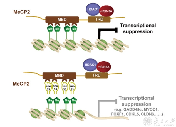研究利用SNORD33结合蛋白质谱分析技术,发现SNORD33存在与甲基化结合蛋白MeCP2的结合。数据显示,SNORD33水平下调会增加MeCP2与下游靶基因启动子甲基化区域的结合,释放MeCP2的转录抑制活性,进一步抑制包括GADD45α、MYOD1、FOXF1、CDKL5、CLDN6在内的凋亡相关的基因的表达,致使细胞凋亡减少,从而使得三阴性乳腺癌细胞对铂类的抵抗增加。
