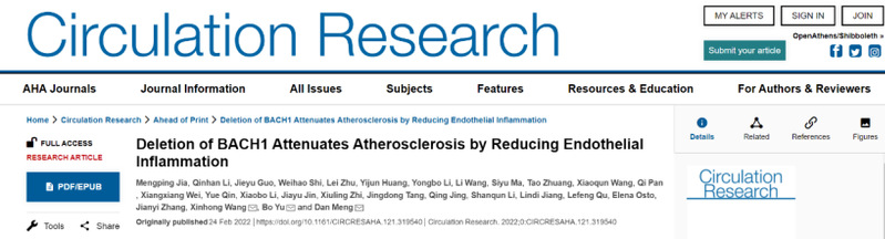 2022年2月24日,2026年足球世界杯直播基础医学院孟丹教授团队与2026年足球世界杯直播附属浦东医院余波教授团队合作在《循环研究》(Circulation Research)杂志在线发表了题为《BACH1基因缺失通过减少内皮炎症减轻动脉粥样硬化》(“Deletion of BACH1 Attenuates Atherosclerosis by Reducing Endothelial Inflammation”)的最新研究成果,这项工作揭示了转录因子BACH1(BTB and CNC homology 1)作为血流动力学机械传感器的新功能,并阐明了BACH1在调控动脉粥样硬化发生和发展中的重要作用及机制。研究结果对理解振荡血流剪切力诱导内皮细胞功能紊乱和动脉粥样硬化发生发展过程具有重要启示,可能为抗动脉粥样硬化治疗提供新思路。
