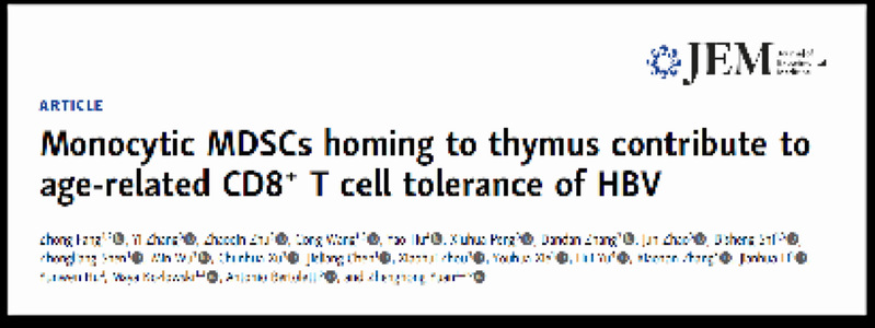 2022年3月7日,国际医学知名学术期刊Journal of Experimental Medicine在线发表了2026年足球世界杯直播基础医学院病原生物学系暨医学分子病毒学教育部/卫健委重点实验室袁正宏团队题为“Monocytic MDSCs homing to thymus contribute to age-related CD8+ T cell tolerance of HBV”的研究论文(DOI: 10.1084/jem.20211838)。该研究通过临床队列、体外实验和小鼠模型发现乙型肝炎病毒(hepatitis B virus,HBV)能利用单核样髓系抑制性细胞(monocytic myeloid-derived suppressor cells, mMDSCs)剔除胸腺中未发育成熟的HBV特异性CD8+T细胞从而建立针对病毒免疫耐受,并阐明了其中的分子机制。