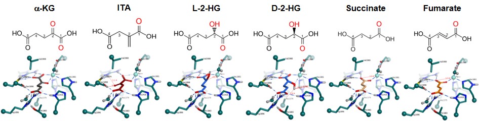 α-KG被报道与TET2蛋白催化中心H1416、R1896和S1898形成氢键和离子键,并且通过其C-1羧基和C-2酮基与Fe(II)以双齿方式结合。与α-KG类似,ITA也是含五个碳原子的二羧酸,尽管拥有C-1位羧基,但其C-2位上的酮基结构被烯烃所替代和无法与Fe(II) 以双齿方式结合,预示着ITA有可能与α-KG竞争结合TET2蛋白催化中心(图1)。体外的核磁共振和生化实验结果证实,ITA与α-KG类似地结合TET2蛋白,其抑制TET2活性IC50为171µM。