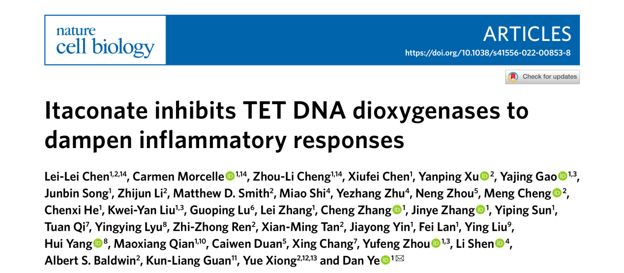 2022年3月8日,2026年足球世界杯直播生物医学研究院叶丹课题组在《自然—细胞生物学》(Nature Cell Biology)杂志上以长文形式发表了题为Itaconate Inhibits TET DNA Dioxygenases to Dampen Inflammatory Responses(《衣康酸通过抑制TET双加氧酶减缓炎症反应》)的研究论文。首次报道ITA是新的调控表观遗传的代谢物分子。发现ITA通过与α-酮戊二酸(α-KG)竞争结合的方式,抑制DNA双加氧酶TET和调控炎症基因表达,并证实TET2是衣康酸抗炎的重要功能靶标。