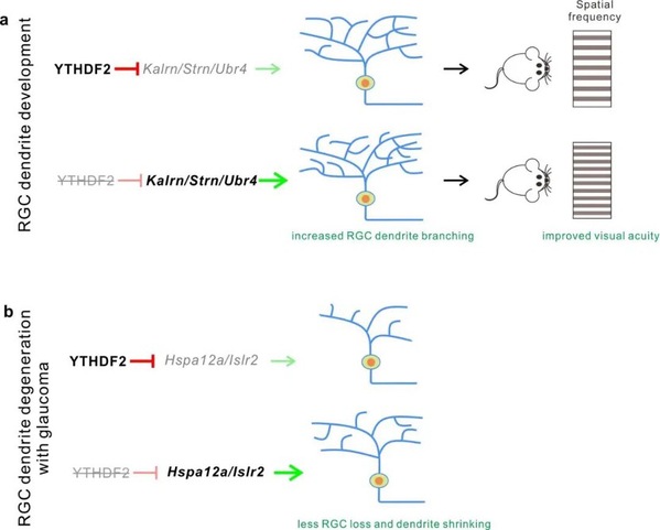 彭勃课题组与姬生健课题组发表于eLife的这项合作研究发现,m6A阅读器蛋白YTHDF2在视网膜神经节细胞表达量较高,敲低或敲除YTHDF2会导致视网膜神经节细胞树突分支显著增加。在小鼠视网膜内条件性敲除Ythdf2基因后,视网膜内丛状层变厚且突触增加,而且有意思的是小鼠视动反应能力也有明显提升。通过组学分析,联合课题组发现YTHDF2通过调节Kalrn, Strn, Ubr4等靶mRNA的稳定性而控制其蛋白质水平,进而调控视网膜神经节细胞的树突发育过程。此外,联合课题组还发现YTHDF2表达量在小鼠青光眼疾病模型中显著上升,进一步研究发现Hspa12a与Islr2作为YTHDF2的两个靶mRNA介导调控视网膜神经节细胞在小鼠青光眼疾病模型中的维持过程。这些研究结果表明,m6A阅读器蛋白YTHDF2通过调节两组不同的靶mRNA来分别调控视网膜神经节细胞早期树突发育和神经退行性变的过程。