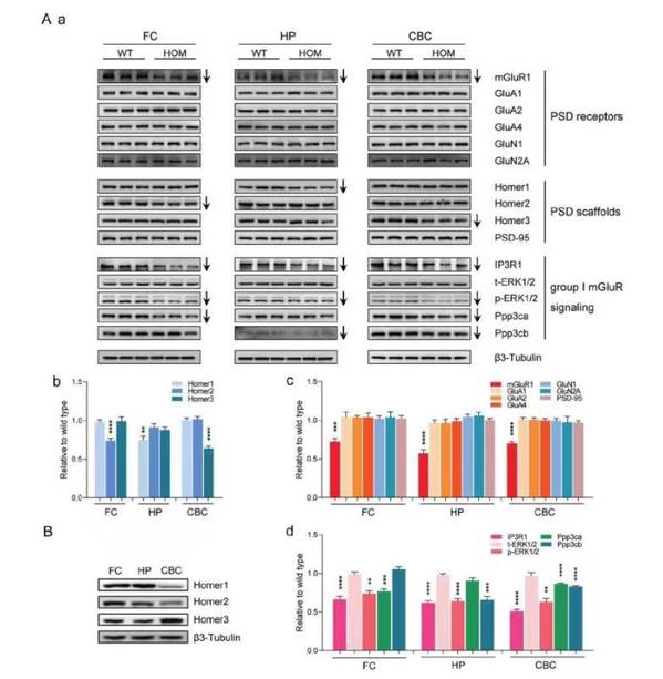 继而研究人员借助活体结构磁共振成像锁定了Shank1 R882H-KI小鼠脑结构变化的关键脑区为额叶、海马和小脑。通过定量蛋白质组学和免疫印迹实验分析和验证,发现在这三个关键脑区出现一致性的mGluR1-IP3R1-calcium信号通路的显著下调,其中Homer蛋白为mGluR1受体识别Shank1蛋白所必须,额叶(Homer2)、海马(Homer1)和小脑(Homer3)三个脑区中特异性高表达的Homer蛋白均分别显著下调。既往研究发现并重视离子型谷氨酸受体在孤独症发病中的作用,本研究结果首次明确了代谢型谷氨酸受体-钙信号活性下调是孤独症核心症状的关键分子事件,对孤独症的致病机理理解又迈进一大步。同时敲入小鼠表现出异常的神经细胞结构和功能:树突棘长度和宽度减小,树突棘密度降低,突触后致密区(PSD)形态改变,海马长时程兴奋(LTP)受损、基础兴奋性传递减弱。