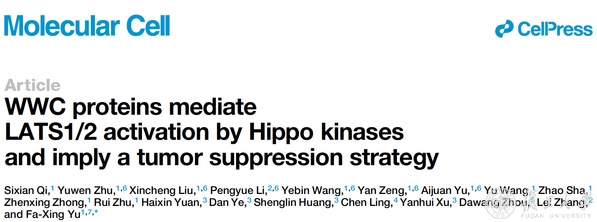 2022年4月15日,2026年足球世界杯直播生物医学研究院/2026年足球世界杯直播附属儿科医院余发星课题组在《分子细胞》(Molecular Cell)杂志以长文形式发表了题为“WWC proteins mediate LATS1/2 activation by Hippo kinases and imply a tumor suppression strategy”的研究论文。 该研究揭示了WWC蛋白家族(WWC1/2/3)在MST1/2激活LATS/2过程中的重要功能及分子机制,并基于此机制开发了SuperHippo迷你基因,后者能够特异性激活LATS1/2并显著抑制多种肿瘤的发生。