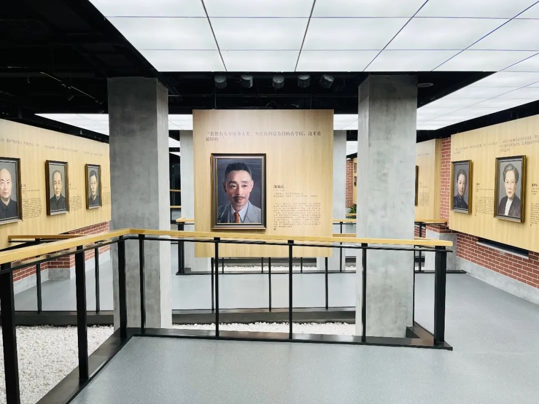 “医学丰碑”连廊连接了“探索发展”与“改革振兴”两个展厅,采用油画的形式还原了上医16位一级教授的容貌风采,同时引用一级教授的话语来体现上医先贤对医学教育事业和上医发展的关心与期待。同时,这一连廊还展示了上世纪五六十年代上医的22位二级教授、23位三级教授和5位四级教授。