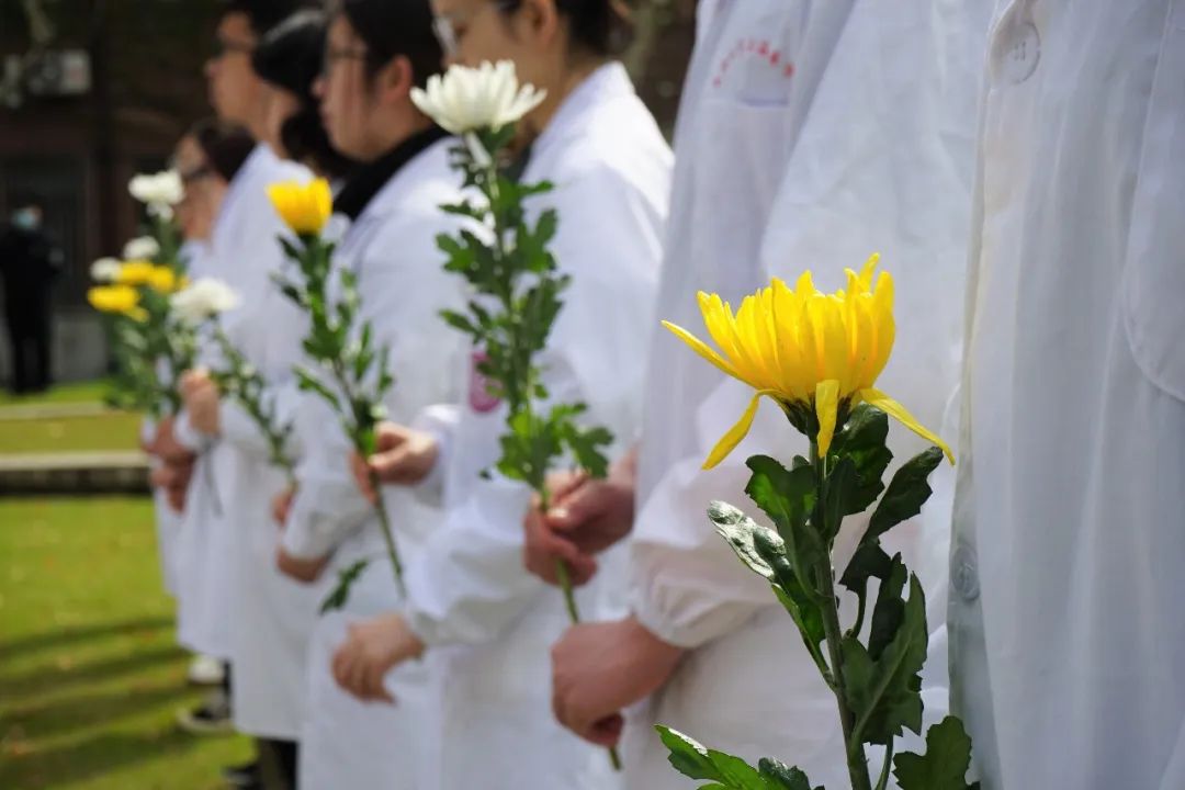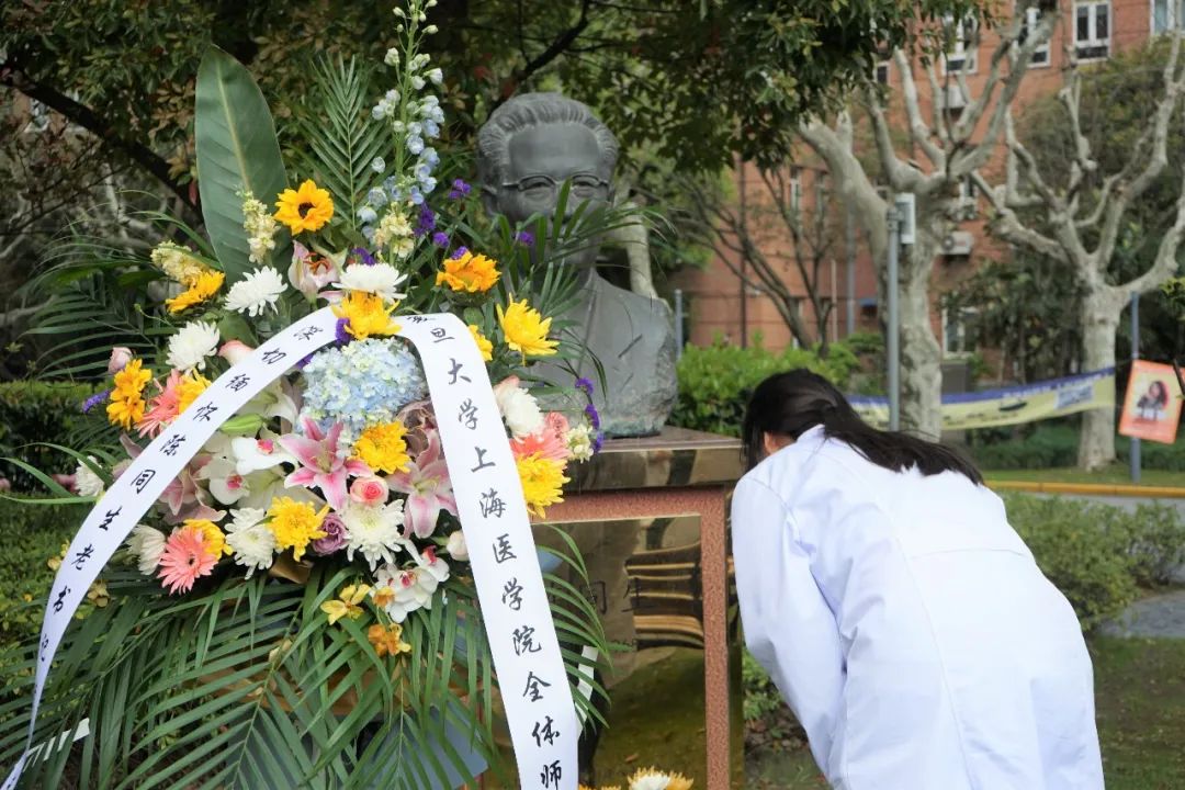无数上医前辈严谨治学,医德高尚,对上医的发展产生了深远影响。学生代表和教师代表分别向伫立在校园内的上医创始人颜福庆先生塑像以及上医老书记、老院长陈同生同志塑像敬献花篮和鲜花,全体肃立鞠躬。