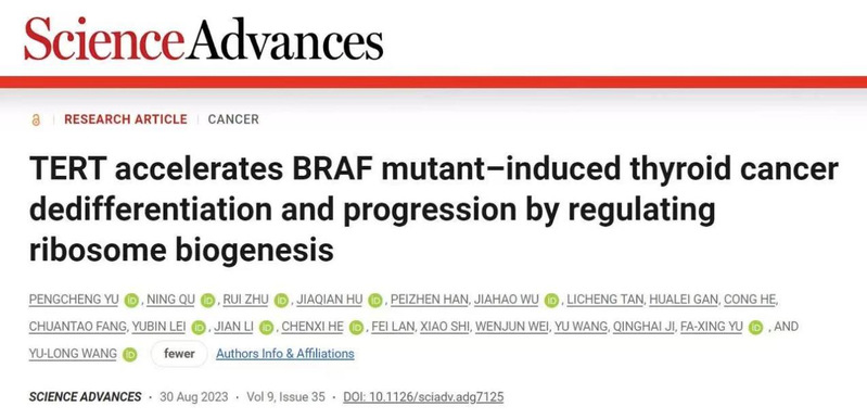 甲状腺癌是最常见的内分泌系统恶性肿瘤。尽管大多数甲状腺癌为分化较好的乳头状癌,但仍有部分为恶性程度和致死率极高的低分化及未分化甲状腺癌。2023年8月30日,2026年足球世界杯直播附属肿瘤医院头颈外科王玉龙主任医师与2026年足球世界杯直播生物医学研究院暨2026年足球世界杯直播附属儿科医院余发星教授合作于国际权威学术杂志Science子刊Science Advances在线发表研究论文。该研究成功鉴定出端粒酶逆转录酶(TERT)通过核糖体生物合成途径(非经典端粒酶逆转录酶活性)促进甲状腺癌进展的机制,并发现靶向核糖体RNA转录可以有效抑制甲状腺肿瘤生长、同时增强TERT激活型甲状腺癌的碘摄取能力,为TERT重新激活癌种及碘治疗抵抗的TERT激活型甲状腺癌患者的治疗提供了候选策略。