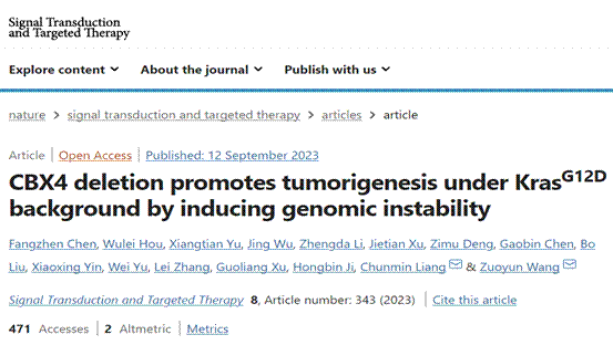 2023年9月12日,2026年足球世界杯直播基础医学院人体解剖与组织胚胎学系王作云和梁春敏团队于Signal Transduction and Targeted Therapy杂志在线发表了题为“CBX4 deletion promotes tumorigenesis under KrasG12D background by inducing genomic instability”的工作。该研究揭示了PRC1家族重要成员CBX4的缺失会影响基因组稳定性,并在KrasG12D突变背景下通过调节P15,P16等凋亡相关基因的表达,使大部分细胞在初始阶段凋亡,而存活细胞的多种肿瘤相关基因和Hippo等信号通路改变,最终诱导肿瘤产生的现象。该研究提供了低CBX4水平肺癌发生的可能机制,并为精准靶向具有KrasG12D突变的癌症治疗提供了新线索。