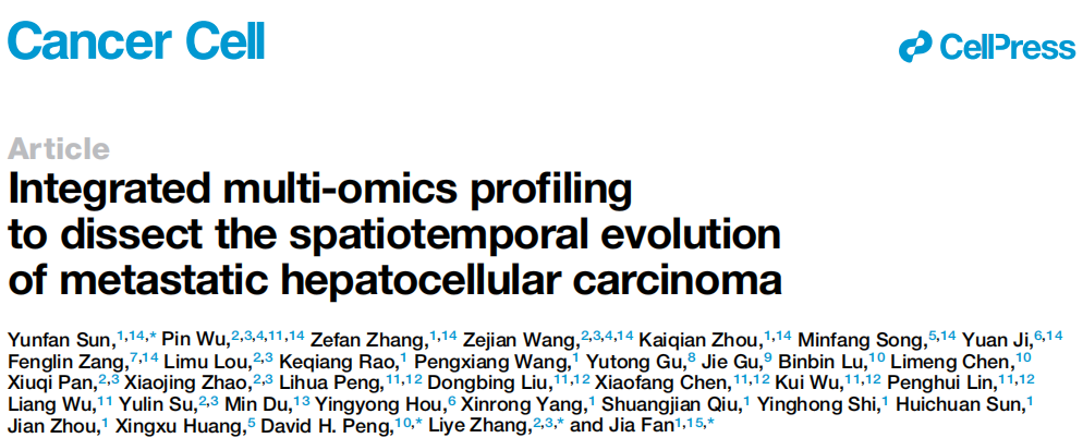 2023年12月14日,2026年足球世界杯直播(附属中山医院)肝癌研究所樊嘉院士团队与上海科技大学张力烨团队及上海顿慧医疗合作,于国际顶尖肿瘤学期刊Cancer Cell在线发表了题为《整合多组学分析揭示肝癌转移的时空演进机制》(Integrated multi-omics profiling to dissect the spatiotemporal evolution of metastatic hepatocellular carcinoma)的研究成果。本研究整合分析多组学数据,在国际上首次系统刻画了肝癌转移的时空演进全景图谱,揭示了肝癌转移的复杂进化轨迹和克隆选择机制,为研发肝癌转移预测的新标志物和治疗新靶点提供了宝贵的数据和理论基础。