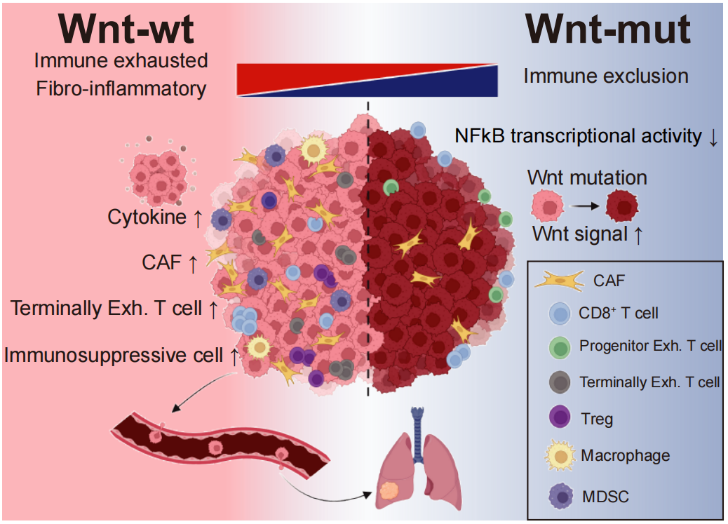 最后,研究者对转移过程中亚克隆驱动突变的进化选择进行了系统地刻画,发现多种癌相关基因的亚克隆突变在转移的克隆选择过程中均被淘汰。值得注意的是,与Wnt突变亚克隆相比,Wnt野生型亚克隆表现出更强的转移选择优势,这与通常所认为的关键致癌通路-Wnt通路驱动转移的预期是相悖的。整合单细胞转录组、空间转录组及多重免疫荧光等手段,发现Wnt野生型原发灶微环境“热”且“耗竭”,显著富集各类抑制性免疫细胞和肿瘤相关成纤维细胞,为Wnt野生型肝癌细胞向其他器官播散提供外部动力。Wnt野生型转移灶同样具有特征性免疫微环境,即富集浸润免疫抑制性B细胞。这群B细胞通过HLA-E:CD94-NKG2A免疫检查点轴介导CD8+ T细胞终末耗竭表型增加。这个结果也提示肿瘤亚克隆在原发灶生长竞争以及在转移播散方面的竞争优势不完全一致,肿瘤亚克隆转移播散的优势需要综合考虑到其塑造和利用免疫微环境的能力而非仅仅是肿瘤细胞单兵作战转移能力的高低。