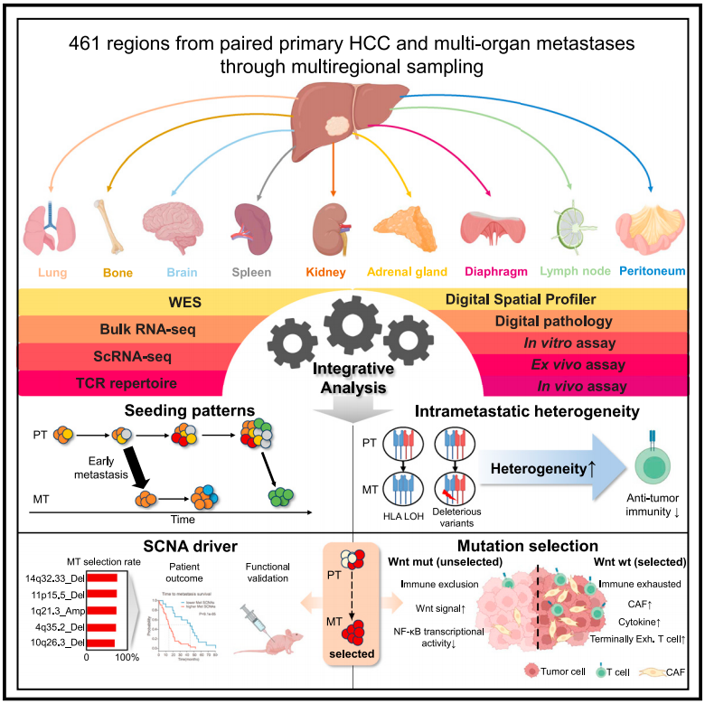肝细胞癌(简称“肝癌”)是世界上最常见的恶性肿瘤之一,在我国尤为高发,每年新发病例和死亡病例均占全球近一半。手术切除是目前肝癌治疗的首选方式,但70-80%的肝癌病人确诊时已发生肿瘤播散转移,为中晚期肝癌,失去了手术机会;即使手术切除,肝癌术后5年转移复发率高达60-70%。肝癌的转移复发是影响病人长期生存的主要原因,并已成为进一步提高肝癌整体疗效的瓶颈。目前肝癌转移肿瘤的基因突变和分子表达全景图谱仍极度缺乏,肝癌在转移过程中的克隆选择等演化规律尚不清晰,导致肝癌转移病灶的临床诊疗仍然缺乏足够的理论指导。全面深刻认识肝癌转移复发的内在机制,探索更有效的干预新策略,已成为进一步提高肝癌病人总体生存率的关键课题。