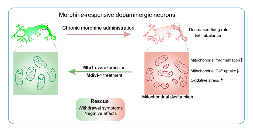 这项研究揭示了脑内多巴胺系统线粒体功能障碍是阿片药物长期使用导致负性强化的重要细胞机制,提示线粒体动力学是阿片类药物使用障碍治疗的新靶标,线粒体药物在阿片成瘾治疗中的具有重要的转化价值。