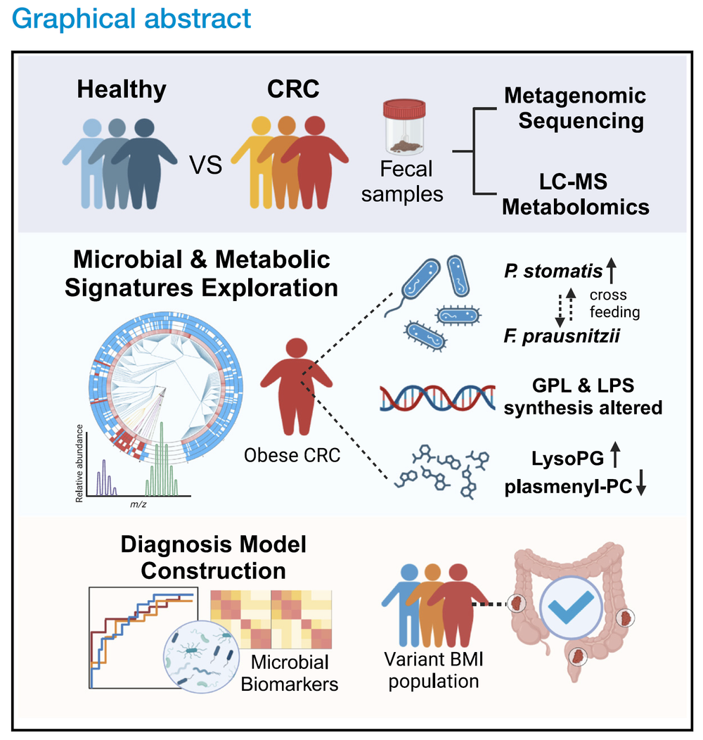这项研究利用了宏基因组测序和代谢组学分析,纳入收集了不同体重指数(BMI)的超过五百例结直肠癌患者及健康人队列粪便样本,揭示了不同体重肠癌尤其是“肥胖型肠癌”的特征。研究发现,不同体重组结直肠癌患者的肠道微生物组成存在明显差异,在肥胖患者粪便组织内多种潜在致癌菌丰度升高、益生菌丰度降低,具体表现为胃瘤消化链球菌在肠癌患者富集且与BMI呈显著正相关;而益生菌普拉梭菌在肠癌患者中丰度明显降低,并与BMI呈正相关。此外,沟迹优杆菌、口腔链球菌以及丁酸梭菌均在肥胖肠癌队列中丰度出现显著改变。