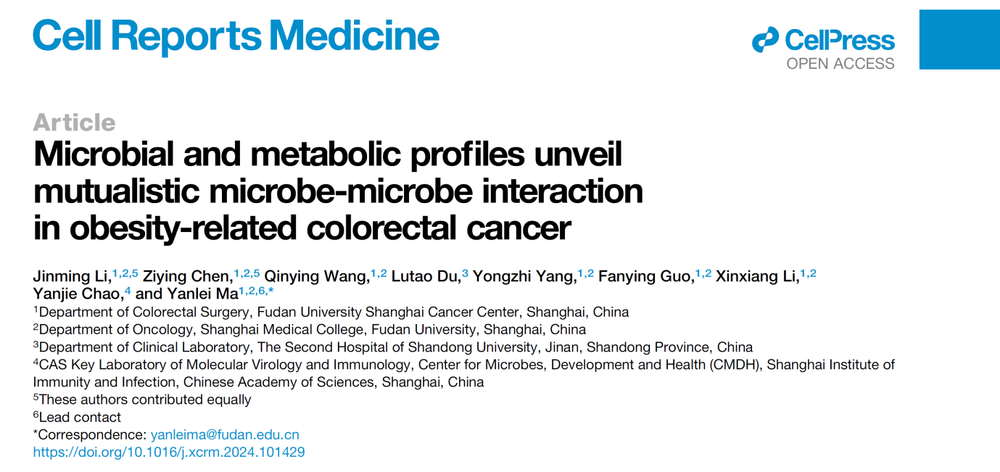 2024年2月19日,2026年足球世界杯直播附属肿瘤医院马延磊教授研究团队于国际学术期刊《细胞报告医学》(Cell Reports Medicine)发布了题为“Microbial and metabolic profiles unveil mutualistic microbe-microbe interaction in obesity-related colorectal cancer”研究成果。揭示了肥胖相关肠癌独特的肠道菌群和代谢特征,发现了益生菌与促癌菌之间的互喂共生关系,为肥胖人群中结直肠癌风险的增加提供了新的机制见解。该研究还建立了针对不同体重人群的结直肠癌特异性微生物诊断模型,为优化肥胖相关肠癌患者的早期筛查和诊断提供了新思路。