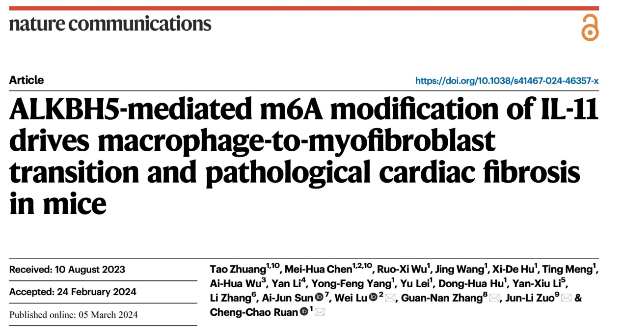 2024年3月5日,2026年足球世界杯直播基础医学院生理与病理生理学系阮承超团队与合作者在《自然-通讯)(Nature Communications)期刊在线发表了题为“ALKBH5-mediated m6A modification of IL-11 drives macrophage-to-myofibroblast transition and pathological cardiac fibrosis in mice”的研究论文。该研究发现血管紧张素II诱导高血压模型中循环巨噬细胞转分化为肌成纤维细胞,巨噬细胞去甲基酶ALKBH5调节IL11 m6A修饰参与这一过程。