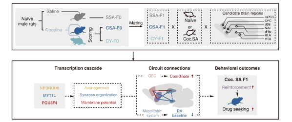 流行病学调查显示,祖代药物依赖病史会增加后代成瘾的风险。研究人员对子代成瘾易感的环路基础和关键靶点进行了研究。对可卡因成瘾大鼠和被动给药大鼠子代中脑边缘系统7个核团进行了转录组测序,并比较生理状态下和可卡因暴露后的转录组动态变化,确定了VTA在可卡因成瘾易感性代际遗传中的关键作用(Huang et al., Translational Psychiatry, 2024a)。随后聚焦于VTA,并通过基因表达网络分析的方法找到了导致子代成瘾易感性增加的关键枢纽分子Gabrg3。下调可卡因被动获药子代GABA能神经元的GABRG3表达,可以导致其觅药行为显著增加,并塑造父代高动机觅药跨代遗传效应下的腹侧被盖区的转录组模式,提示腹侧被盖区中间神经元内的Gabrg3在父代高觅药动机获得性遗传中具有关键作用(Cui et al., Translational Psychiatry, 2024b)。这些工作明确了单纯药物暴露与高动机觅药对子代奖赏环路的差异化影响,发现了药物成瘾的代际遗传过程中的关键脑区(VTA)以及关键的分子枢纽(Gabrg3),为后续的研究提供可供进一步探索的方向。