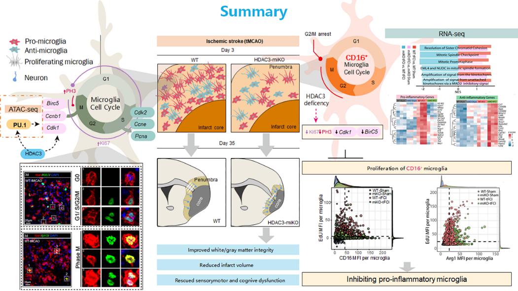 本研究在缺血性脑卒中(tFCI)后小胶质细胞中观察到HDAC3 表达量增加,提示小胶质细胞中的HDAC3可能在缺血性脑卒中发挥着作用。作者构建了小胶质细胞特异性敲除HDAC3的小鼠(HDAC3-miKO),发现HDAC3-miKO小鼠改善了缺血性脑卒中后的长期预后。核磁共振 T2WI 的结果显示 HDAC3-miKO 改善 tFCI 后的脑水肿和脑梗死。免疫荧光染色和电生理的复合动作电位结果显示 HDAC3 miKO 改善了 tFCI 后的白质结构和功能。行为学结果显示HDAC3 miKO显著改善了tFCI 造成的感觉运动和学习记忆功能障碍。流式分选获得的 tFCI后 3 天脑内小胶质细胞,进行 RNAseq 的基因集富集分析发现,小胶质细胞的表达谱发生了显著的变化。一方面,与野生型小鼠相比,HDAC3 miKO的小胶质细胞中促炎基因表达减少,抗炎基因表达增加;另一方面,HDAC3 miKO的小胶质细胞中与有丝分裂相关的基因显著下调,表明HDAC3敲除后,小胶质细胞的增殖受到抑制。有趣的是,HDAC3 miKO选择性地显著抑制了CD16+促炎态的小胶质细胞增殖,而Arg1+抗炎修复态小胶质细胞的增殖能力没有显著改变,从而减轻了脑内炎症。 结合ATACseq测序分析发现 PU.1 参与了 miKO-tFCI 后的选择性抑制小胶质细胞的增殖。值得注意的是,新型AAV 病毒(AAV-PU.1)特异性小胶质细胞PU.1 过表达部分逆转了HDAC3-miKO 的神经保护作用。研究表明HDAC3/PU.1 轴可能是驱动缺血性脑卒中后促炎态小胶质细胞增殖和免疫反应的关键分子(图2)。该研究为缺血性脑卒中靶向抑制小胶质细胞 HDAC3的精准治疗提供理论基础。