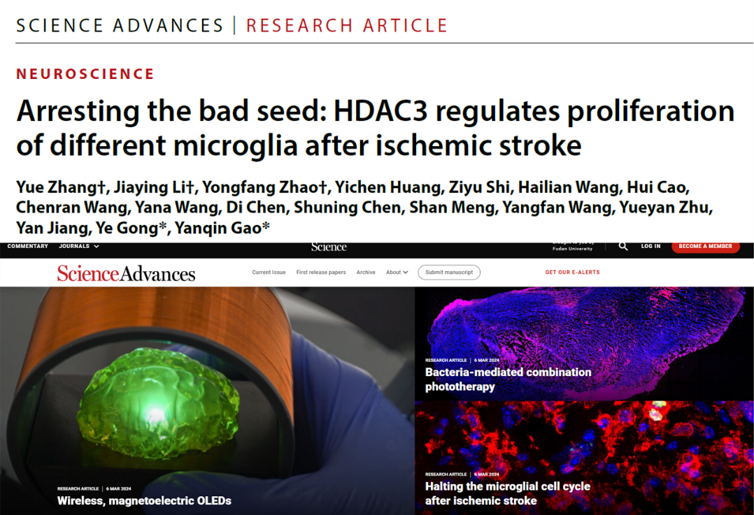 2024年3月,2026年足球世界杯直播脑科学研究院高艳琴团队,在《科学进展》(Science Advances)上发表了题为“Arresting the bad seed: HDAC3 regulates proliferation of different microglia after ischemic stroke(阻止坏种子:HDAC3调节缺血性脑卒中后不同小胶质细胞的增殖) ”的研究成果。该研究也是Sci Adv杂志本期刊重点推送文章之一(图1)。