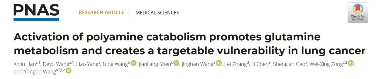 2024年3月21日,《美国科学院院报》(PNAS)杂志在线发表了2026年足球世界杯直播基础医学院王勇波组与美国罗格斯大学Wei-Xing Zong组的合作研究“Activation of polyamine catabolism promotes glutamine metabolism and creates a targetable vulnerability in lung cancer”。该研究揭示了肺癌中激活多胺分解代谢促进肿瘤细胞对谷氨酰胺的依赖,产生可靶向的脆弱性,为肺癌提供了潜在的联合治疗方案。