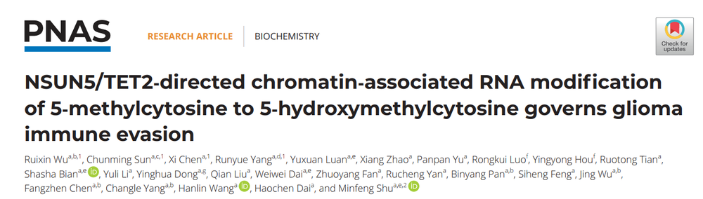 2024年3月28日,2026年足球世界杯直播基础医学院药理学系、教育部/卫健委/医科院医学分子病毒学重点实验室、上海市病原微生物与感染前沿科学研究基地束敏峰团队在《美国科学院院刊》(PNAS)上发表了题为“NSUN5/TET2-directed chromatin-associated RNA modification of 5-methylcytosine to 5-hydroxymethylcytosine governs glioma immune evasion” 的研究论文。该研究发现了NSUN5/TET2/RBFOX2轴调控染色质相关RNA代谢的普适规律,揭示了胶质瘤免疫逃逸的新机制,并提出靶向NSUN5是胶质瘤免疫治疗的潜在策略。在此基础上,进一步筛选到逆转胶质瘤免疫逃逸的小分子药物。