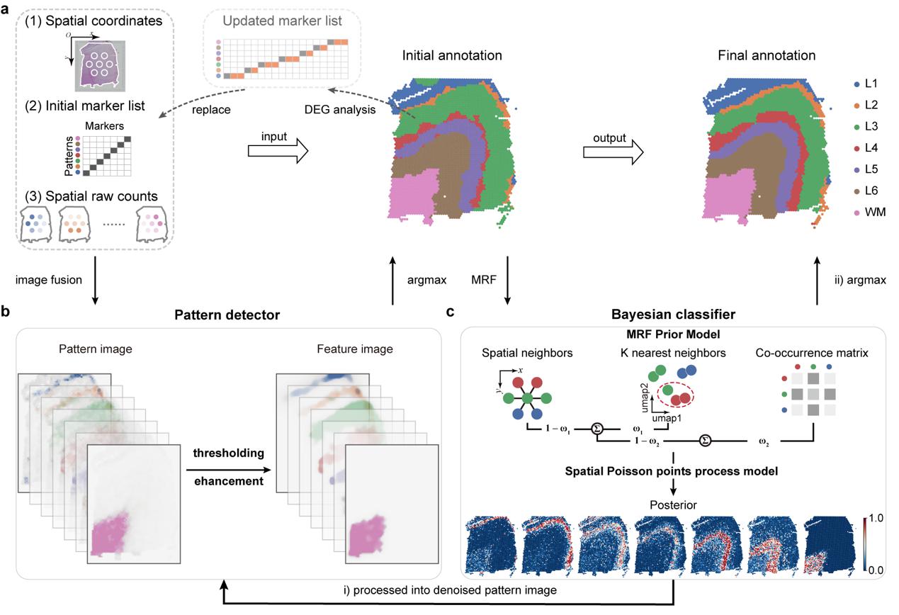 团队将计算机视觉中对数字图像的“语义分割”概念迁移至空间转录组数据,创新性地将标记基因的空间表达处理为伪模式图像,设计了模式检测器,为后续贝叶斯分类器提供稳健的先验分布。该分类器结合马尔可夫随机场(MRF)与空间泊松点过程(sPPP),充分利用了 sPPP 建模RNA-seq计数数据分布的能力,同时考虑了空间点的位置信息。在MRF先验模型的设计中,团队充分考虑了转录组和空间位置的局部相似性,以及点之间的整体一致性。在这项研究中,作者展示了 Pianno 在注释各种形状的解剖结构以及病灶和细胞类型方面的卓越性能,这些数据来自不同的空间技术平台。并且研究表明,用Pianno替代劳动密集型人工标注程序,并与无监督聚类方法相结合,有助于揭示新的生物学见解。