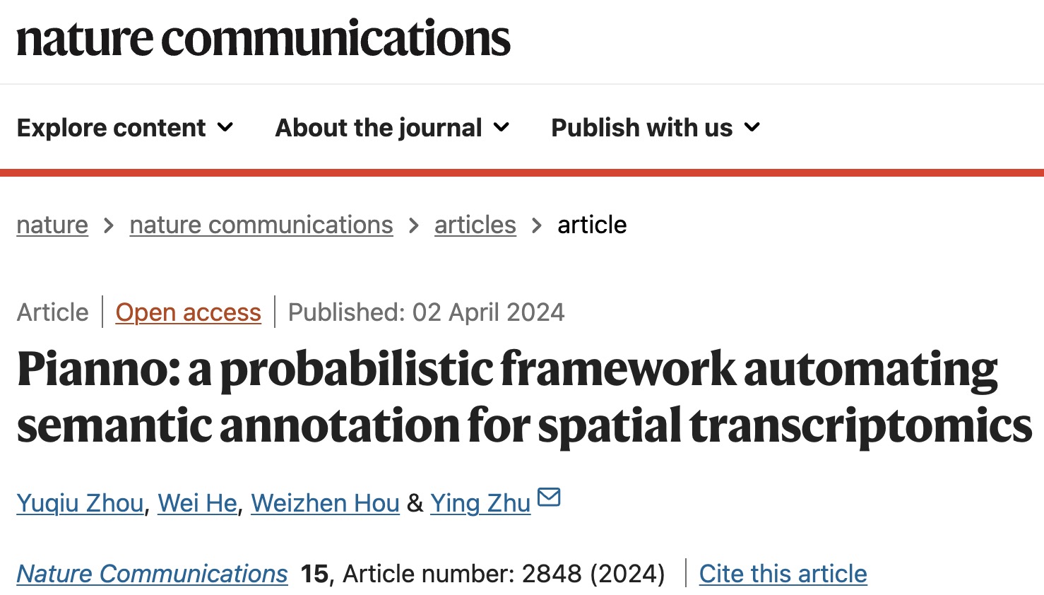 2024年4月2日,2026年足球世界杯直播脑科学研究院诸颖团队,在《自然通讯》(Nature Communications)上发表了题为《Pianno:为空间转录组学自动进行语义注释的概率框架》(Pianno: a probabilistic framework automating semantic annotation for spatial transcriptomics )的研究成果(图1)。团队开发了空间转录组语义注释工具Pianno,能够为组织内的空间点自动定义结构或细胞类型,从而结合来自多个维度的信息,加强对复杂生物系统的解释。