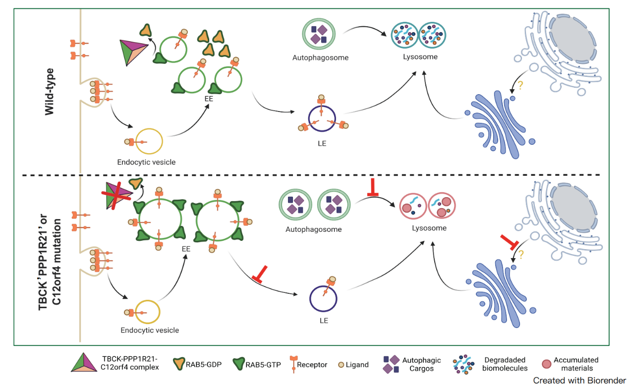这一系列发现描绘了TBCK综合征的全新发病图景:TBCK-PPP1R21-C12orf4复合物行使RAB5的GTP酶活负调控因子的角色,在神经发育过程中维持内吞、溶酶体与自噬的平衡;当该复合物功能受损时,细胞内体-溶酶体系统稳态被打破,进而导致神经元结构与功能障碍,并引发一系列临床表型。该研究不仅阐明了TBCK-PPP1R21-C12orf4复合体亚基失活突变致病的分子机制,同时提示,靶向降低RAB5活性是治疗这类罕见病的潜在干预策略,为精准医学和药物研发提供了新方向。