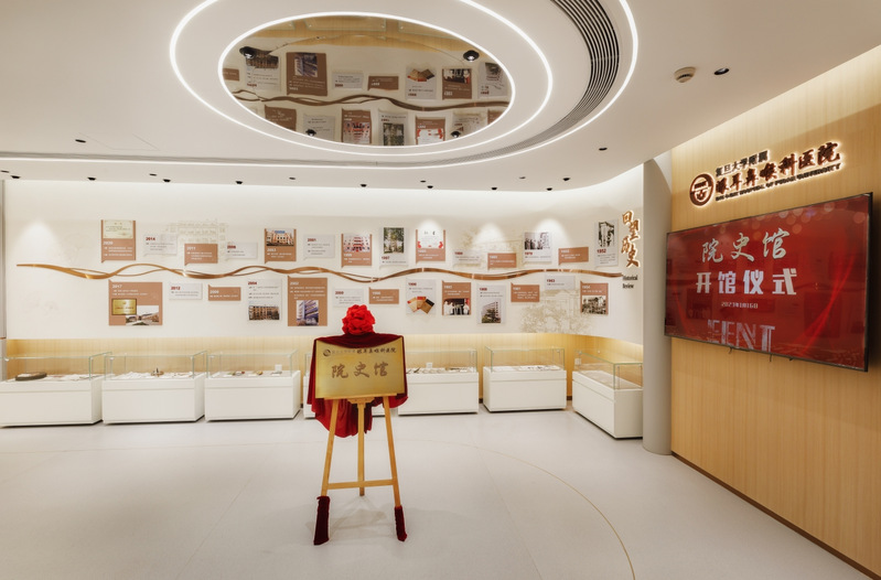 儿科医院院史馆由馆内部分、周边延展区域部分、贵宾接待室部分和科研楼大厅部分等组成。