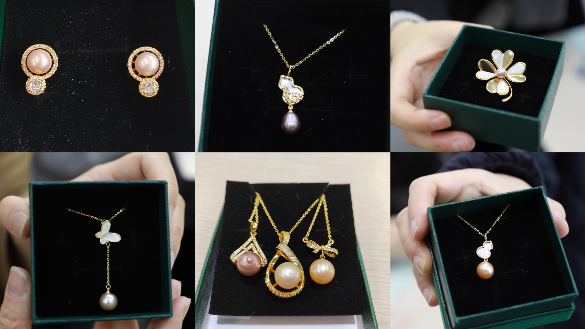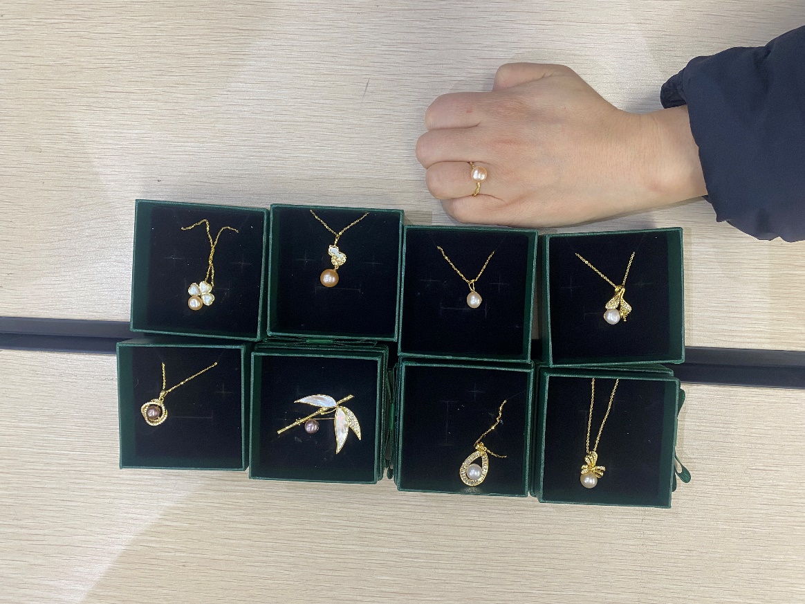 来到室外,大家挑选了自己心仪的珍珠蚌,在专业老师的示范和指导下,小心翼翼的用刀撬开珍珠蚌,当蚌壳打开的一瞬间,大家发出开“盲盒”的欢呼声和赞美声,现场气氛被瞬间点燃。白的、黄的、紫的,圆形、半圆、水滴形,形色各异的珍珠让大家眼前一亮、喜出望外。接着,经过清洗、选珠、抛光、打孔、粘贴等一系列工序,老师们根据个人喜好制作成项链、胸针或戒指,并相互展示着自己的私人订制作品。