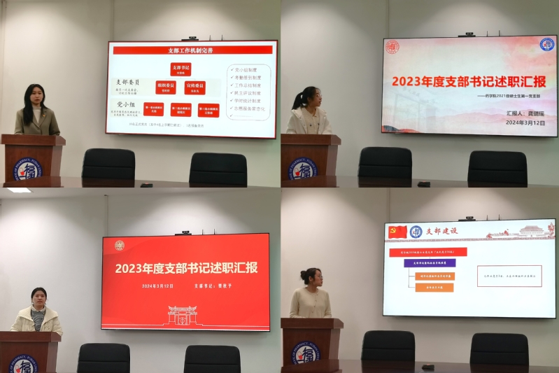 2024年3月12日,药学院学生党总支在科研楼晶晖厅举办2023年度学生党支部书记述职暨优秀党员答辩会。药学院教工第一党支部书记、天然药物学系副主任卢燕,药学院教工第二党支部组织委员、分析测试中心主任杨萍,药学院党委组织员曹旖以及药学院学生工作办公室副主任、学生党总支副书记徐琛出席并担任评委。会议由2020级本科生、第三十批“人才工程”预备队(一期)队员黎瀚尹主持。