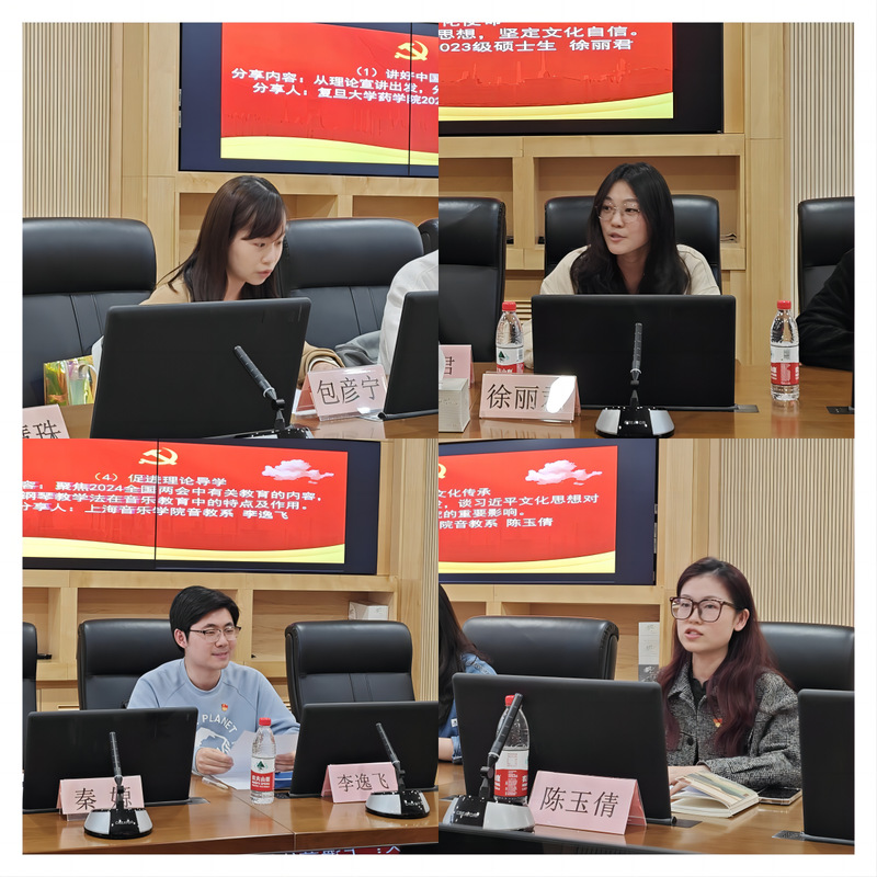 接着,我院2021级直博生包彦宁作为复旦上医院史讲解队队员,从理论宣讲出发,以“讲好中国故事”为主题分享了心得体会;2023级硕士生徐丽君结合个人经历,围绕如何践行文化使命、坚定文化自信分享了自己的感受。上海音乐学院音乐教育系2020级硕士生陈玉倩从学术专业出发,讲述习近平文化思想对传统音乐文化研究的影响,就如何加强文化传承发表看法;2022级硕士生李逸飞聚焦2024全国两会中有关教育的内容,分享钢琴教学法在音乐教育中的特点及作用,为促进文化理论导学提供了新思路。