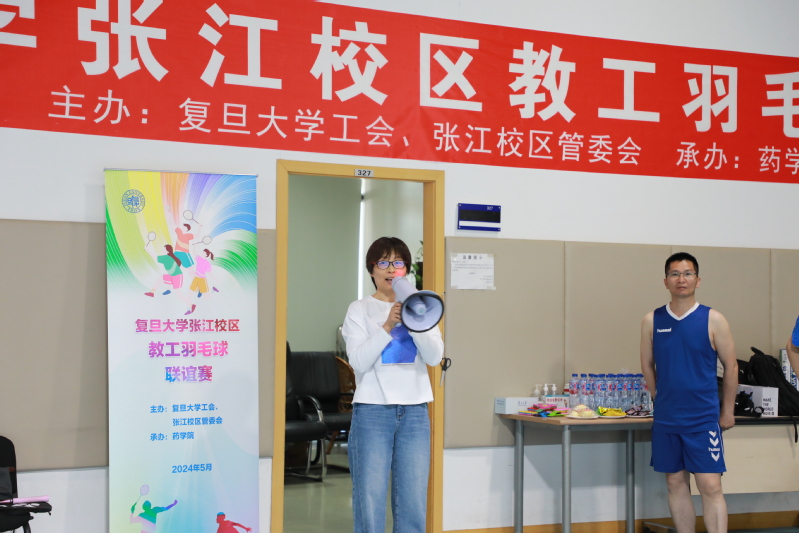 药学院党委副书记史雪茹主持活动并致开场词。她首先对参与本次联谊赛的老师们表示了热烈的欢迎和诚挚的感谢,希望大家通过此次活动能够以球会友、增进友谊,搭建起沟通交流的平台;同时也期待能够吸引更多热爱运动的老师加入其中,扩大朋友圈,丰富张江校区的文化生活,促进学术与体育的共同发展。最后,她祝大家都能在赛场上取得好成绩。